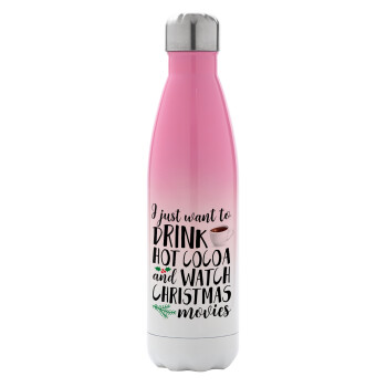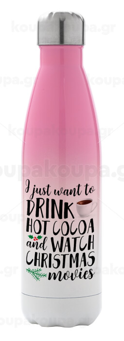 I just want to drink hot cocoa and watch christmas movies, Metal mug thermos Pink/White (Stainless steel), double wall, 500ml