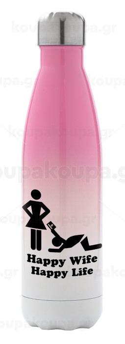 Happy Wife, Happy Life, Metal mug thermos Pink/White (Stainless steel), double wall, 500ml