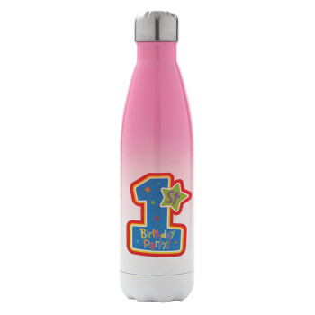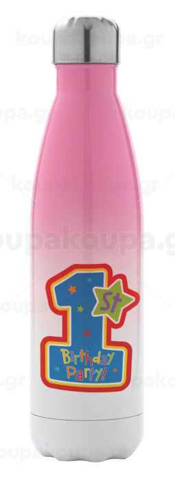 Happy 1st Birthday, Metal mug thermos Pink/White (Stainless steel), double wall, 500ml