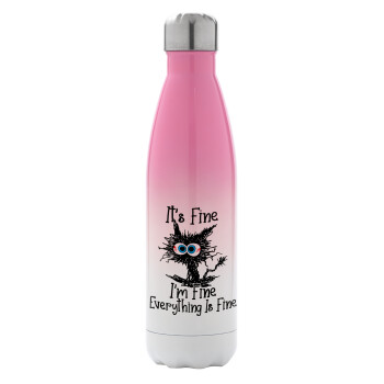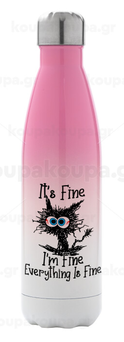 Cat, It's Fine I'm Fine Everything Is Fine, Metal mug thermos Pink/White (Stainless steel), double wall, 500ml
