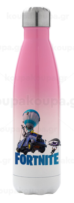 Fortnite Bus, Metal mug thermos Pink/White (Stainless steel), double wall, 500ml