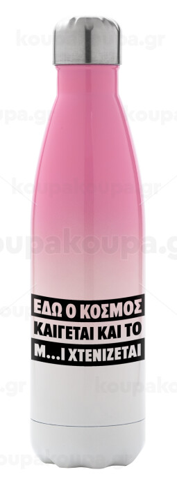 Εδώ ο κόσμος καίγεται και το Μ....Ι χτενίζεται, Metal mug thermos Pink/White (Stainless steel), double wall, 500ml