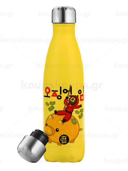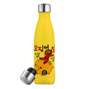 Squid game money pig, Yellow Stainless Steel Metallic Thermos, double-walled, 500ml