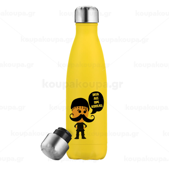 Κρητικός "Ίντα λες ωρέ κοπέλι", Yellow Stainless Steel Metallic Thermos, double-walled, 500ml