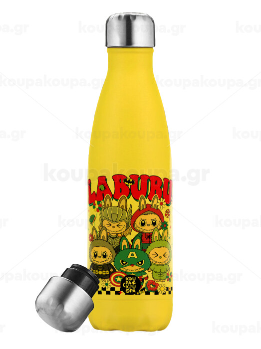 Labubu superheroes, Yellow Stainless Steel Metallic Thermos, double-walled, 500ml