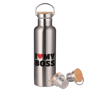 I LOVE MY BOSS, Stainless steel Silver with wooden lid (bamboo), double wall, 750ml