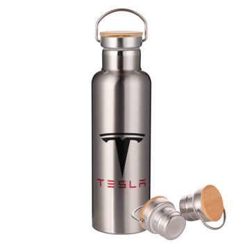 Tesla motors, Stainless steel Silver with wooden lid (bamboo), double wall, 750ml