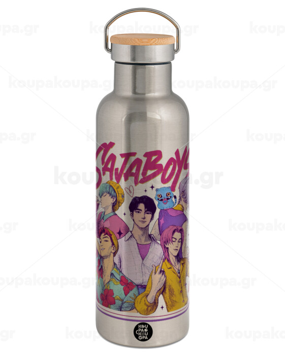 Huntrix Saja Boys, Stainless steel Silver with wooden lid (bamboo), double wall, 750ml