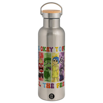 Inside Out It's Okay To Feel All The Feels , Stainless steel Silver with wooden lid (bamboo), double wall, 750ml