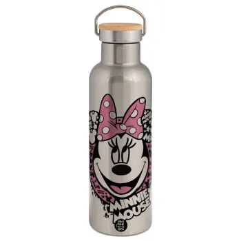 Minnie mouse, Stainless steel Silver with wooden lid (bamboo), double wall, 750ml
