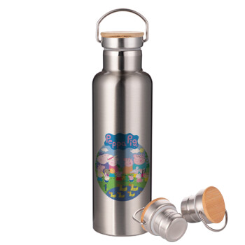 Peppa pig Family, Stainless steel Silver with wooden lid (bamboo), double wall, 750ml