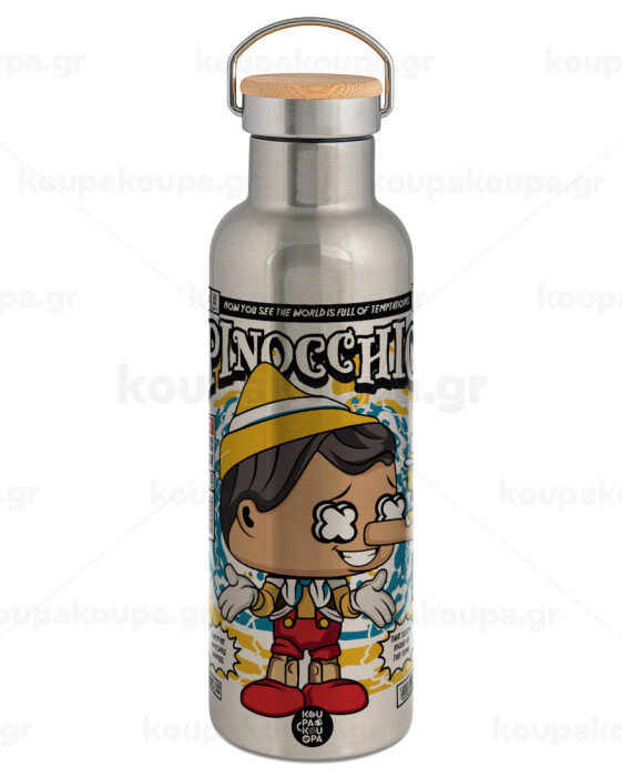 Pinocchio, Stainless steel Silver with wooden lid (bamboo), double wall, 750ml