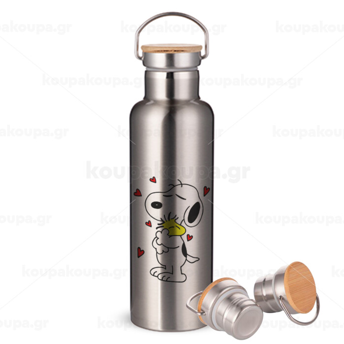 Snoopy Love, Stainless steel Silver with wooden lid (bamboo), double wall, 750ml