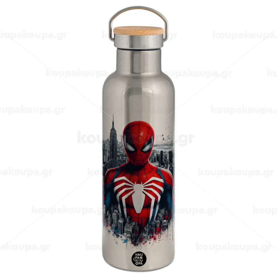 Spiderman City, Stainless steel Silver with wooden lid (bamboo), double wall, 750ml
