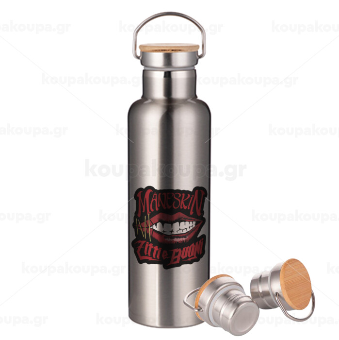 Maneskin lips, Stainless steel Silver with wooden lid (bamboo), double wall, 750ml