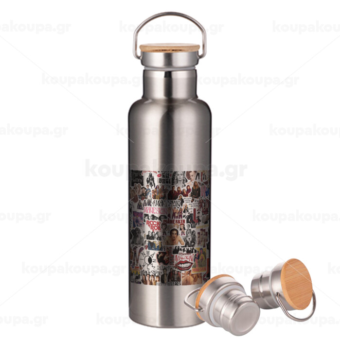 Maneskin stickers, Stainless steel Silver with wooden lid (bamboo), double wall, 750ml