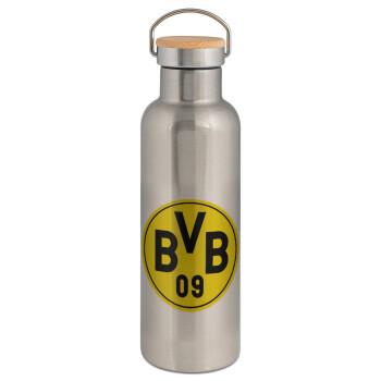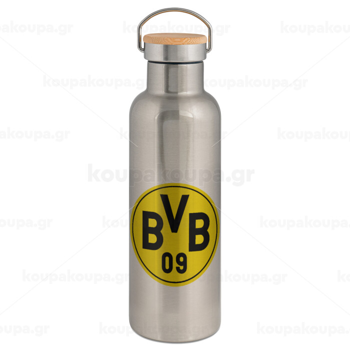 BVB Dortmund, Stainless steel Silver with wooden lid (bamboo), double wall, 750ml