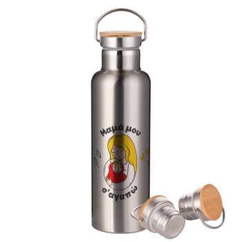Μανούλα σ'αγαπώ αγκαλιά!, Stainless steel Silver with wooden lid (bamboo), double wall, 750ml