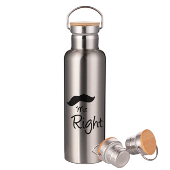 Mr right Mustache, Stainless steel Silver with wooden lid (bamboo), double wall, 750ml