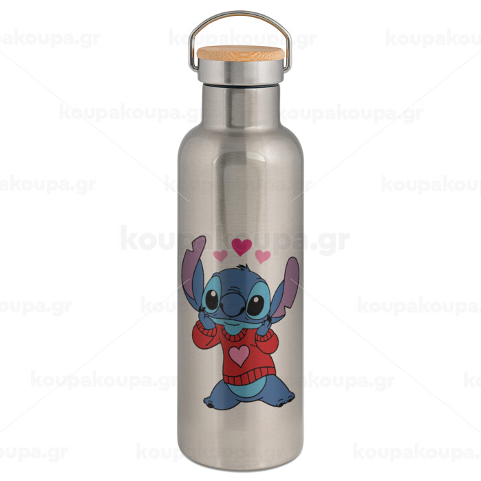 Stitch heart, Stainless steel Silver with wooden lid (bamboo), double wall, 750ml