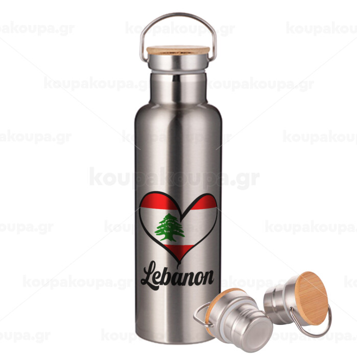 Lebanon flag, Stainless steel Silver with wooden lid (bamboo), double wall, 750ml