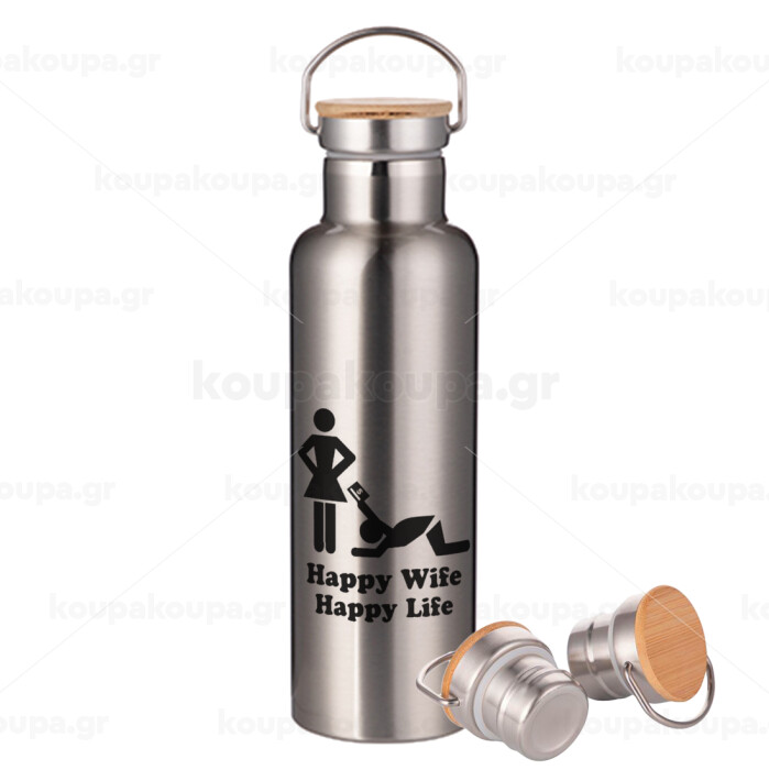 Happy Wife, Happy Life, Stainless steel Silver with wooden lid (bamboo), double wall, 750ml