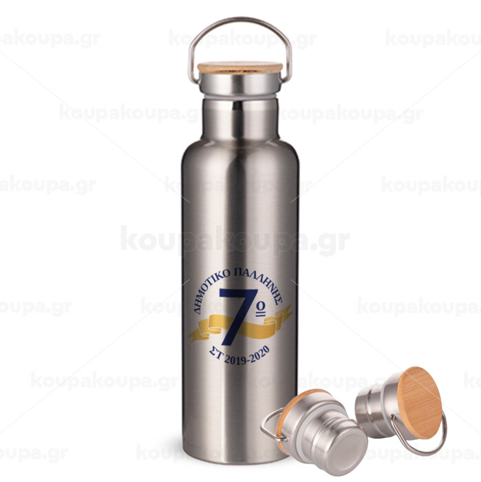 Σχολική μπλε με κορδέλα, Stainless steel Silver with wooden lid (bamboo), double wall, 750ml