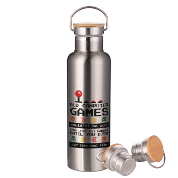OLD computer games couldn't be won just like real life!, Stainless steel Silver with wooden lid (bamboo), double wall, 750ml