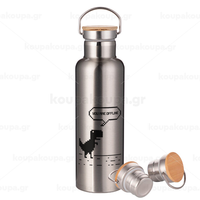 You are offline dinosaur, Stainless steel Silver with wooden lid (bamboo), double wall, 750ml