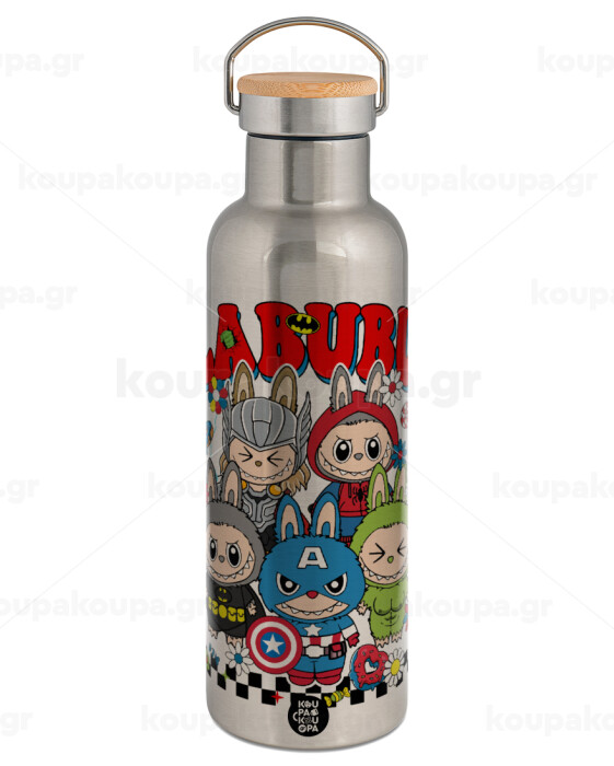 Labubu superheroes, Stainless steel Silver with wooden lid (bamboo), double wall, 750ml