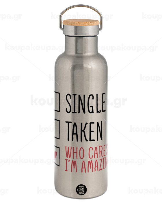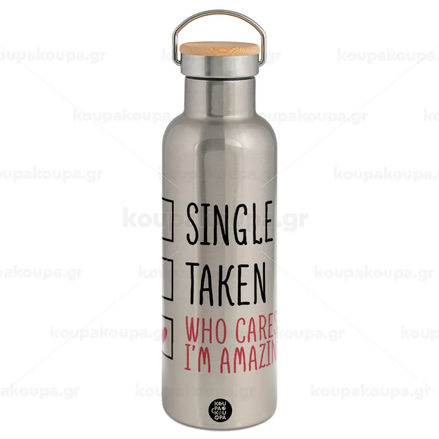 Single, Taken, Who cares i'm amazing, Stainless steel Silver with wooden lid (bamboo), double wall, 750ml