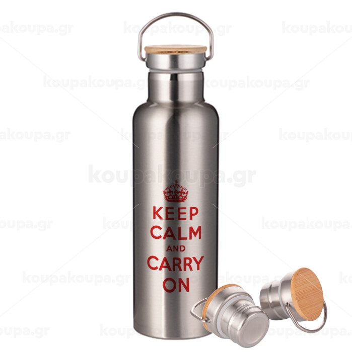 KEEP CALM  and carry on, Stainless steel Silver with wooden lid (bamboo), double wall, 750ml