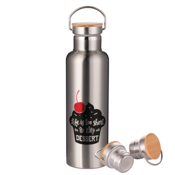 Life is too short, to skip Dessert, Stainless steel Silver with wooden lid (bamboo), double wall, 750ml