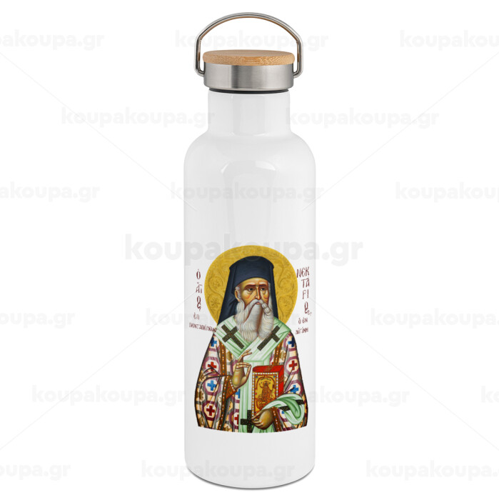 Saint Nektarios, Stainless steel White with wooden lid (bamboo), double wall, 750ml