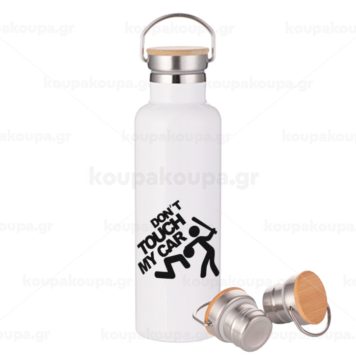 Don't touch my car, Stainless steel White with wooden lid (bamboo), double wall, 750ml