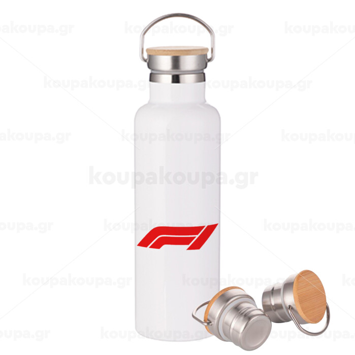 Formula 1, Stainless steel White with wooden lid (bamboo), double wall, 750ml