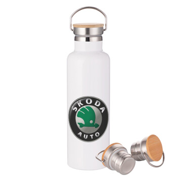 SKODA, Stainless steel White with wooden lid (bamboo), double wall, 750ml