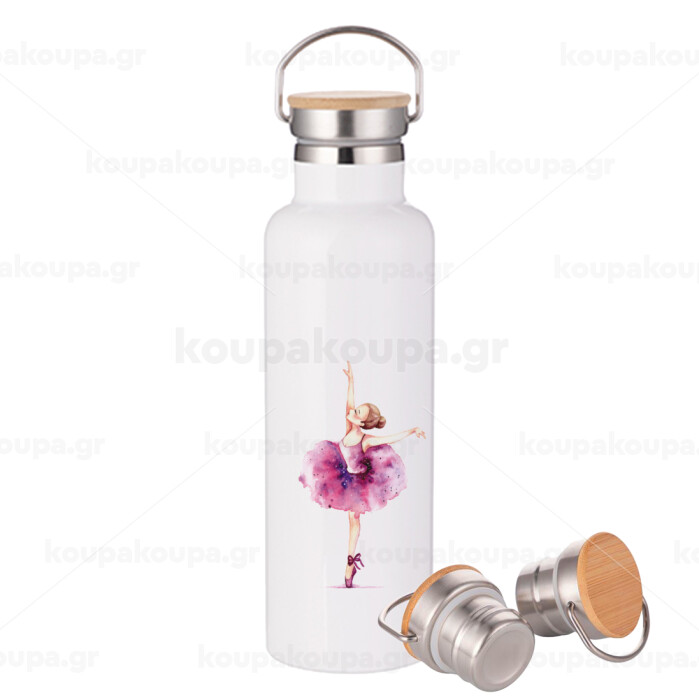 Ballerina watercolor, Stainless steel White with wooden lid (bamboo), double wall, 750ml