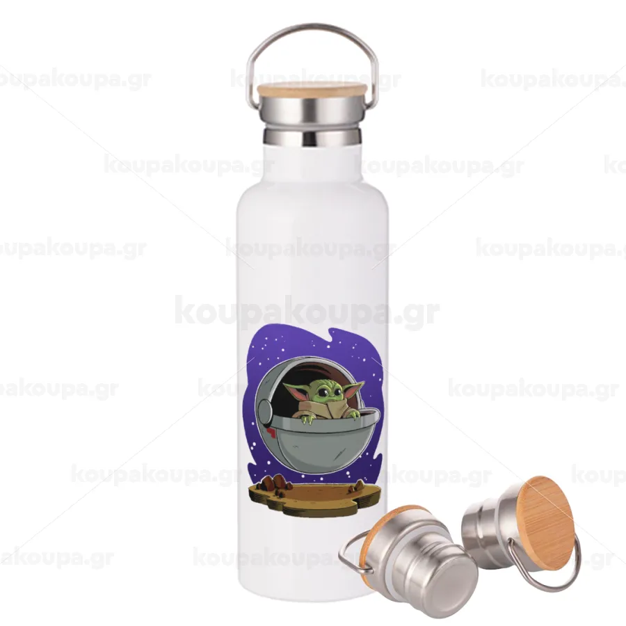 Baby Yoda mandalorian, Stainless steel White with wooden lid (bamboo), double wall, 750ml