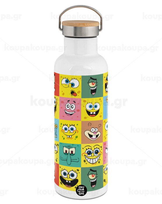 BOB spongebob and friends, Stainless steel White with wooden lid (bamboo), double wall, 750ml