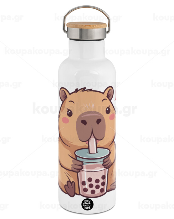 Capybara Bubble Tea, Stainless steel White with wooden lid (bamboo), double wall, 750ml