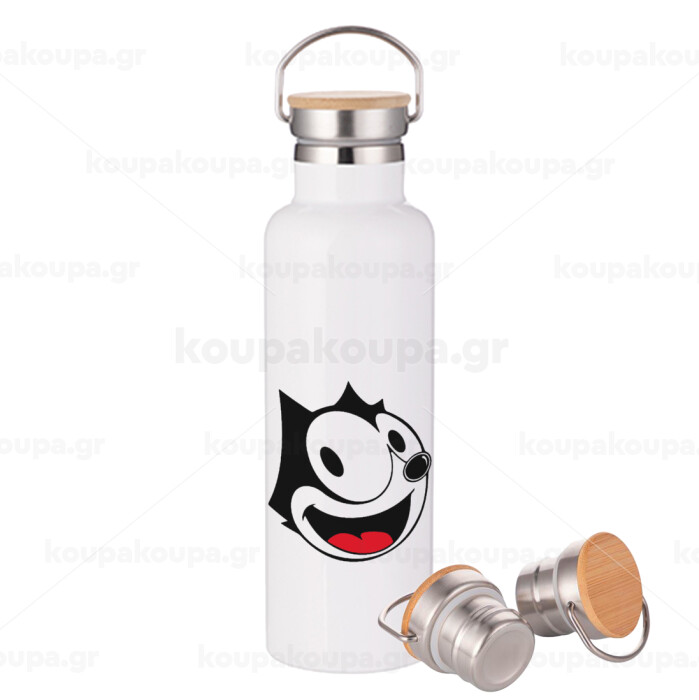 Felix the cat, Stainless steel White with wooden lid (bamboo), double wall, 750ml