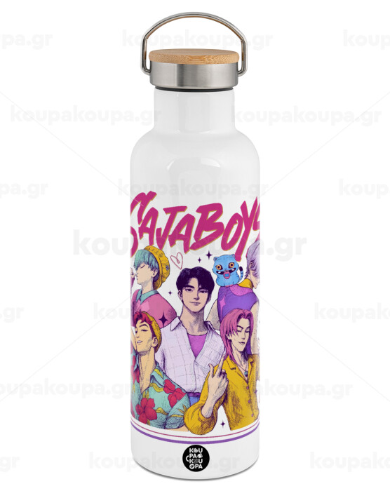 Huntrix Saja Boys, Stainless steel White with wooden lid (bamboo), double wall, 750ml