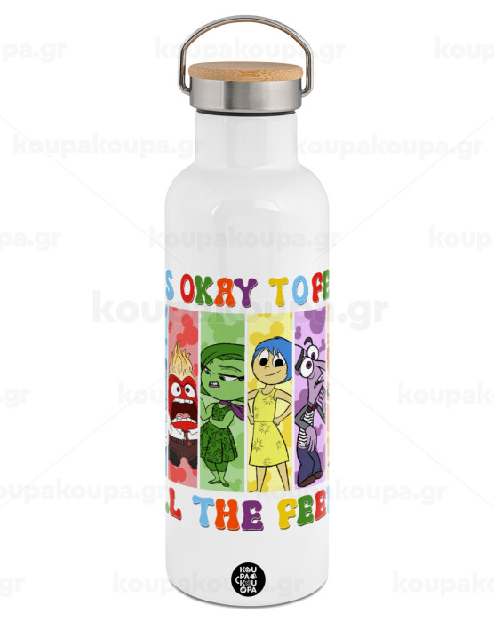 Inside Out It's Okay To Feel All The Feels , Stainless steel White with wooden lid (bamboo), double wall, 750ml