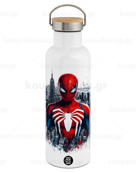 Spiderman City, Stainless steel White with wooden lid (bamboo), double wall, 750ml