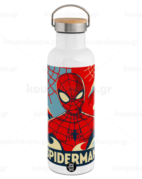 Spiderman kid, Stainless steel White with wooden lid (bamboo), double wall, 750ml