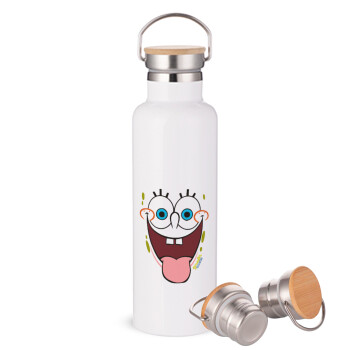 SpongeBob SquarePants smile, Stainless steel White with wooden lid (bamboo), double wall, 750ml