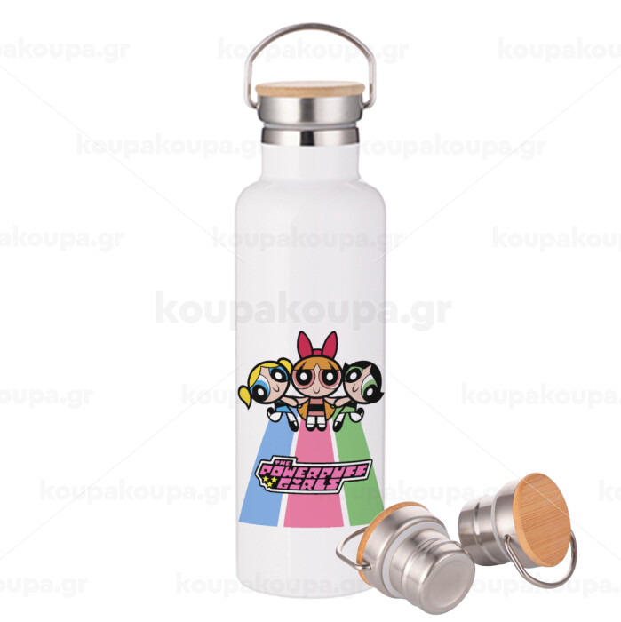 The powerpuff girls , Stainless steel White with wooden lid (bamboo), double wall, 750ml