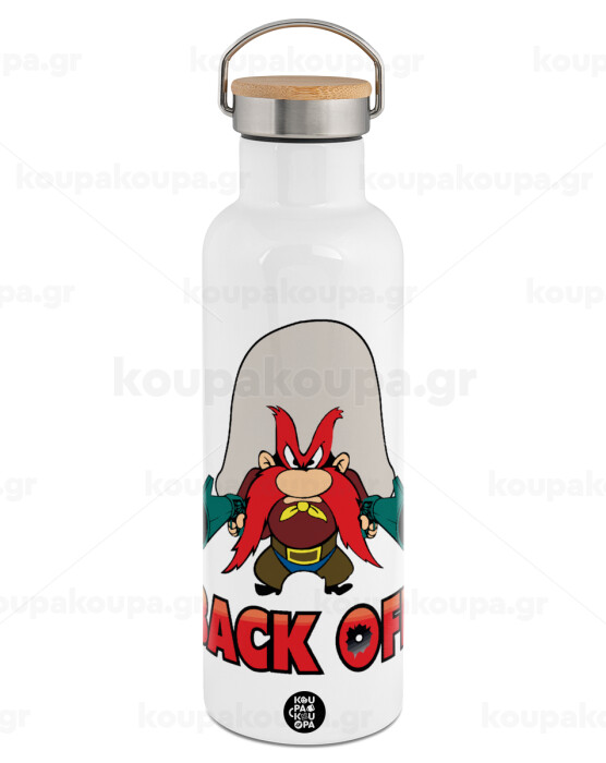 Yosemite Sam Back OFF, Stainless steel White with wooden lid (bamboo), double wall, 750ml