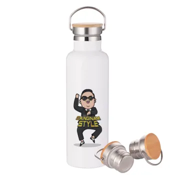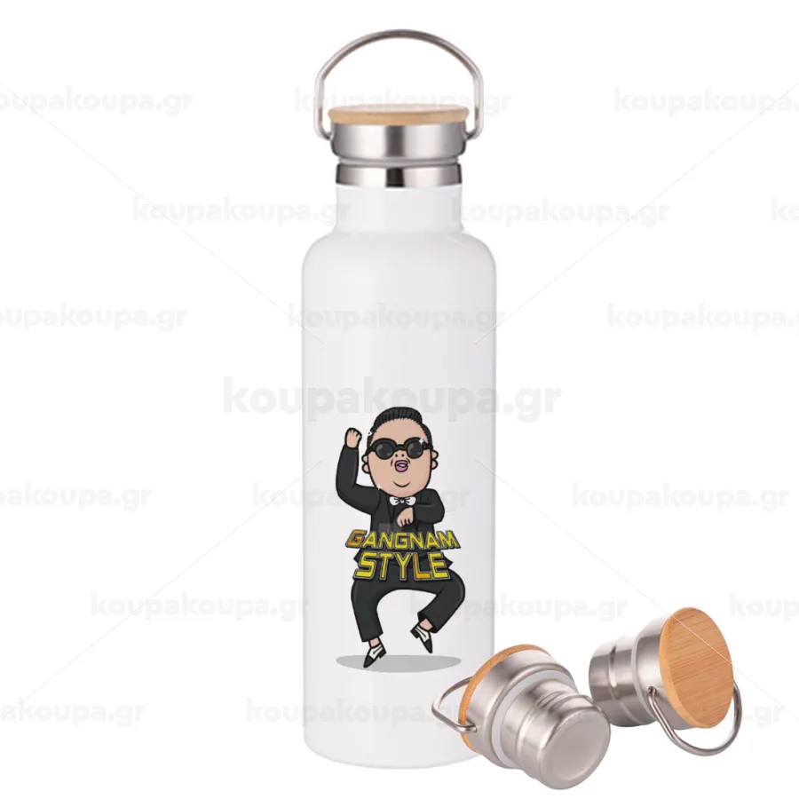 PSY - GANGNAM STYLE, Stainless steel White with wooden lid (bamboo), double wall, 750ml